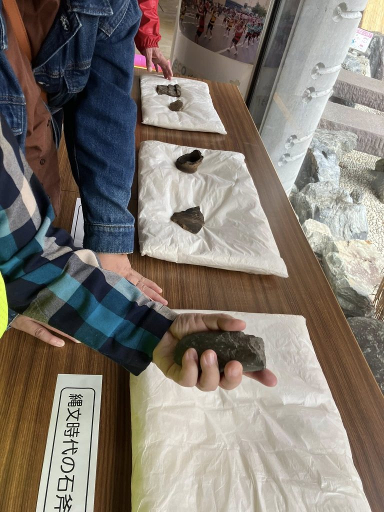 特別に縄文土器や石器を触れるコーナーも作っていただきました。